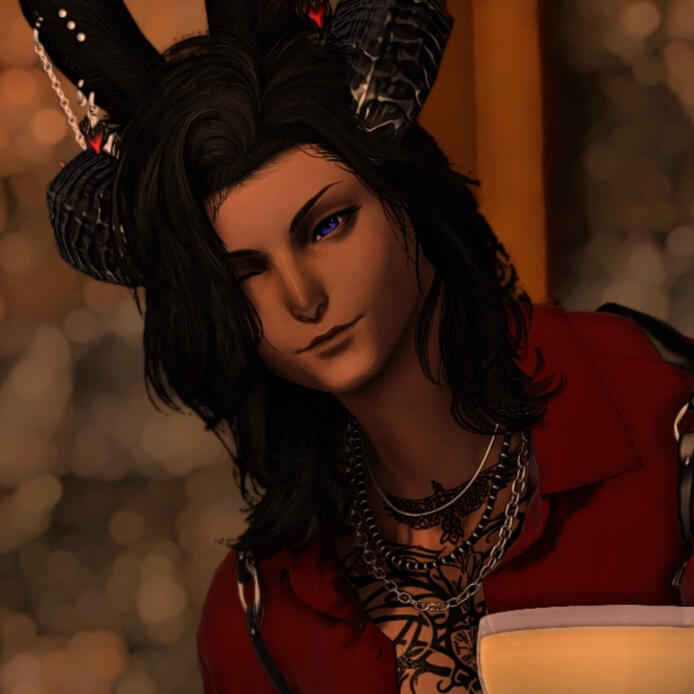 " Ryouma and I were introduced one another out of happenstance when he arrived one evening at the Traveler's Rest with Rasa and Ceci one if I can recall that correctly. It's difficult to say, I was enamoured by his little coeurl companion Sakamoto whom I've since titled him as 'Little Prince'. Ryouma, I would consider a dear friend of mine and immaculate help on the staff side of things when he's able to come. He has a genuine heart and such immaculate talent in the kitchen - do not let him tell you otherwise. "