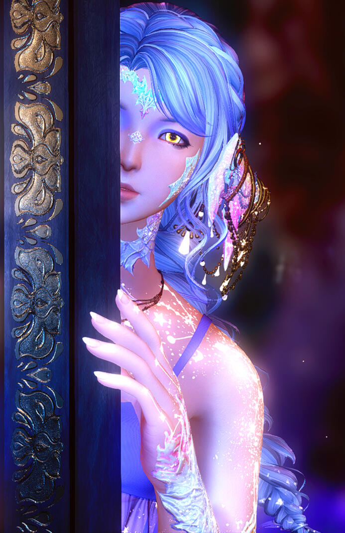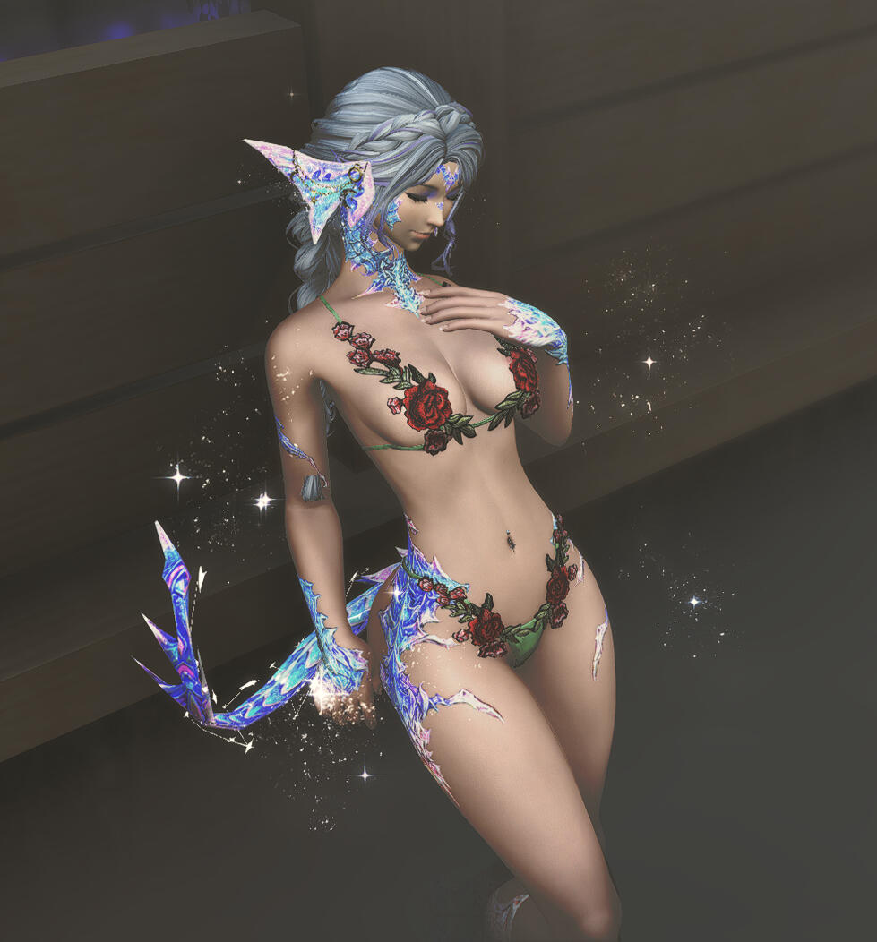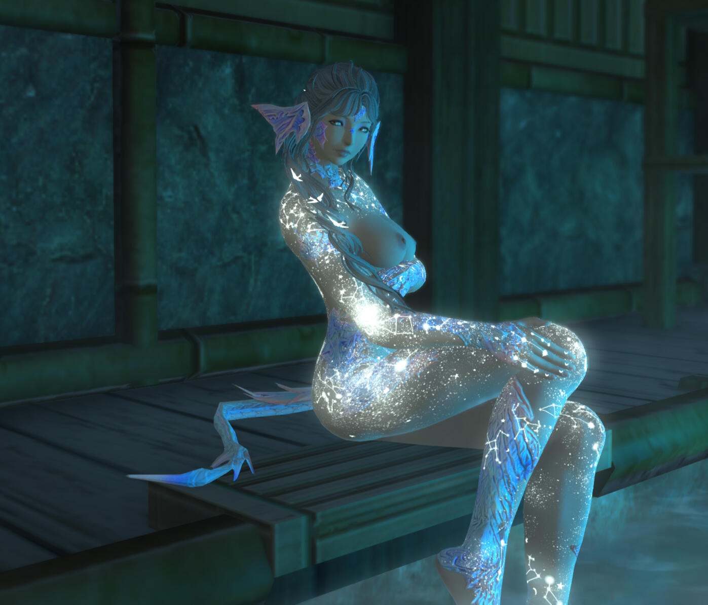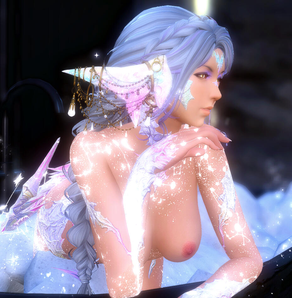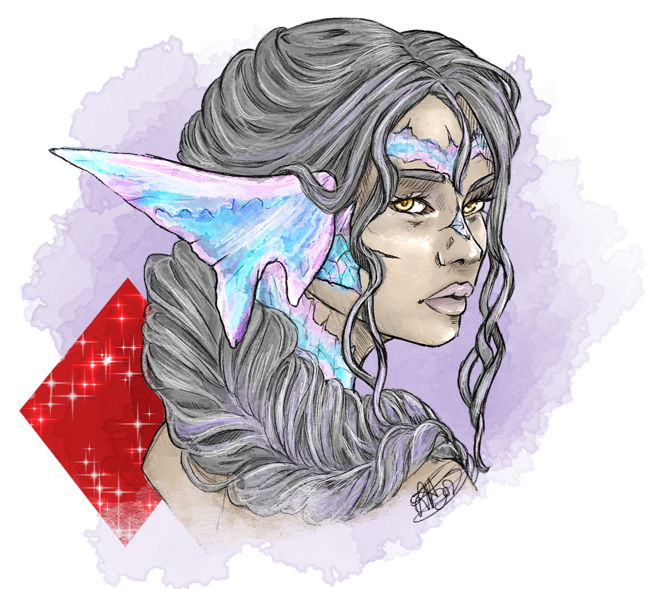 Silver hair with hints of lilac ✦ pale gold eyes ✦ opalescent scales ✦ celestial tattoos